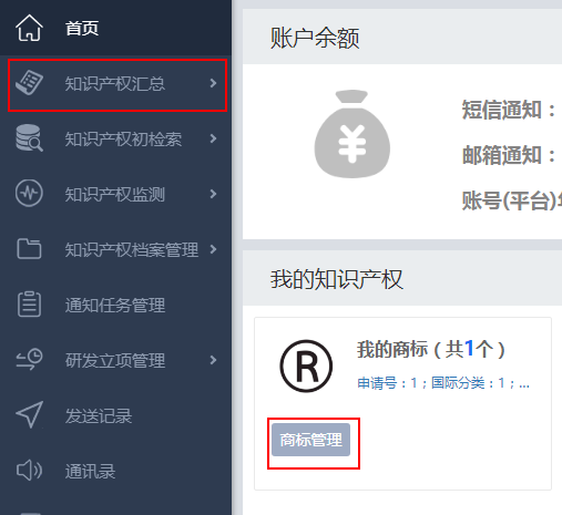 添加商标汇总(第一步):在没有添加过商标汇总数据的情况下,可以在首页的“我的知识产权”栏目中点击我的商标下方的“立即添加”可以直接进行添加(此方法请跳往第三步)。如果此前已有添加过商标汇总数据的情况下,可以点击“商标管理”按钮进入商标管理列表页面。也可以点击导航栏中的“知识产权汇总”里面的商标汇总进入