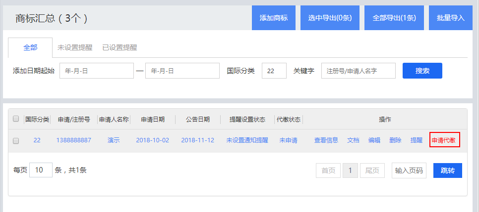 商标代缴费功能(第一步):在商标汇总管理列表页面找出需要代缴费的数据,然后点击操作栏里面的“申请代缴”按钮
