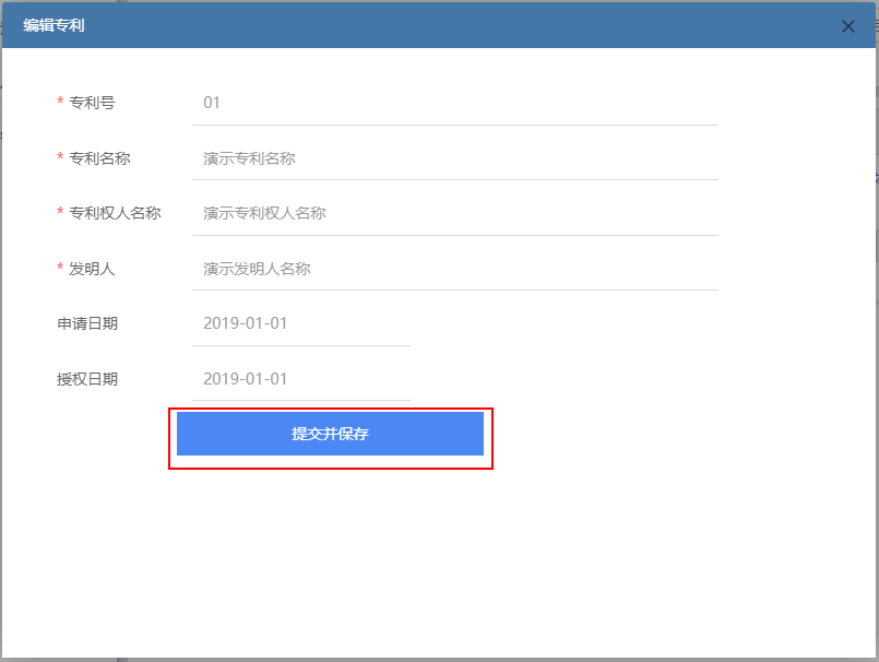 添加专利汇总(第三步):点击添加专利后,在弹出的添加窗口填入自己的信息内容然后点击“提交并保存”即添加完成