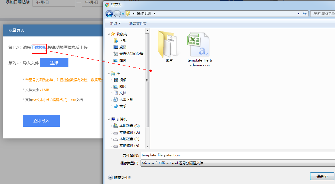 导入专利汇总(第二步):点击批量导入按钮以后,在弹出的导入窗口中,先点击“下载模板”后下载模板