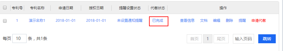专利代缴费功能(第七步):代缴费服务完成后,专利代缴状态会变更为已完成。此时代缴服务已成功完成