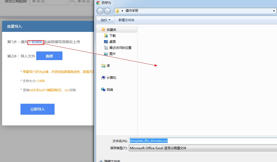 导入域名汇总(第二步):点击批量导入按钮以后,在弹出的导入窗口中,先点击“下载模板”后下载模板